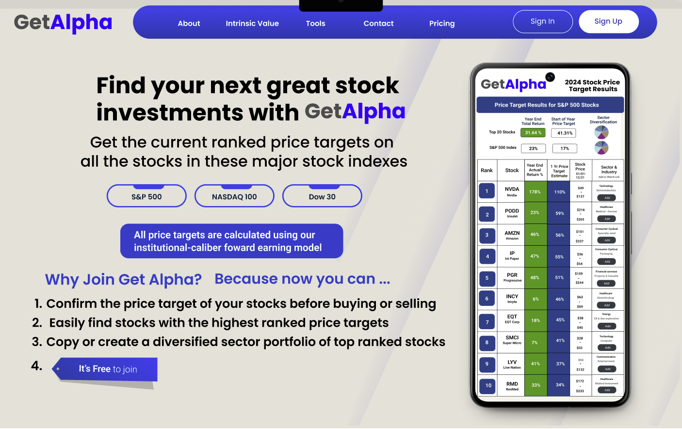 Get Alpha’s mission is to easily show you which stocks currently provide the best upside target. We follow the institutional investment philosophy of Warren Buffet and Howard Marks